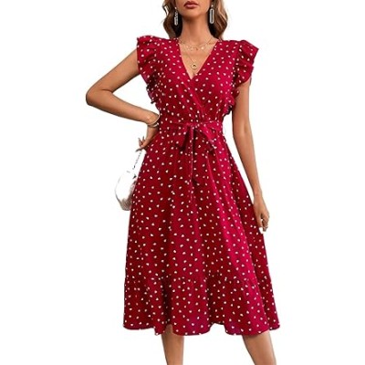 2024 V Neck Cap Sleeve Ruffle Trim Belted A Line Long Dress